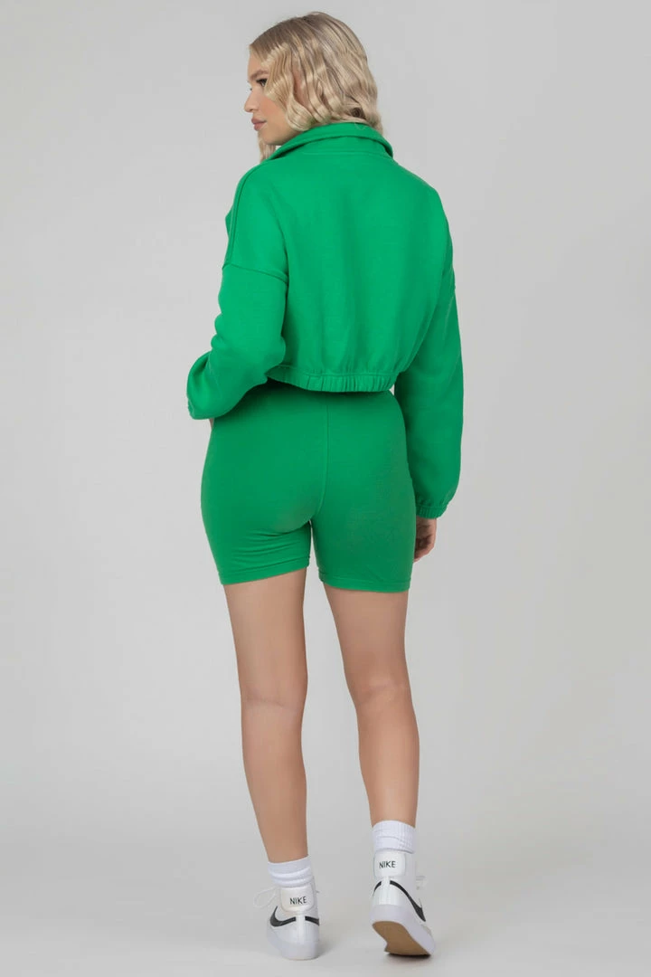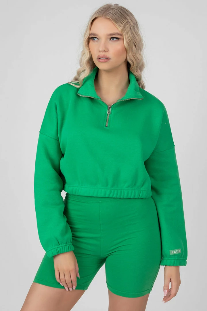 A cropped OVERSIZED FIT sweatshirt featuring a functional half zip, gathered hem and elasticated cuffs in green.