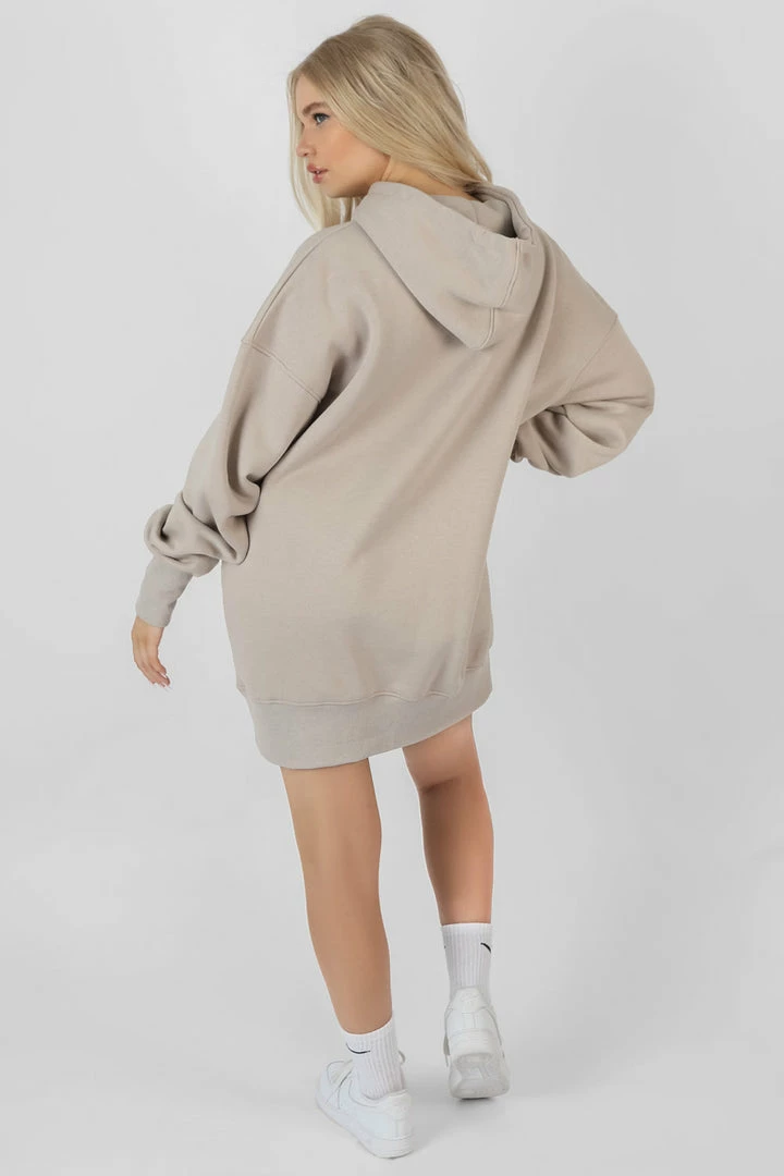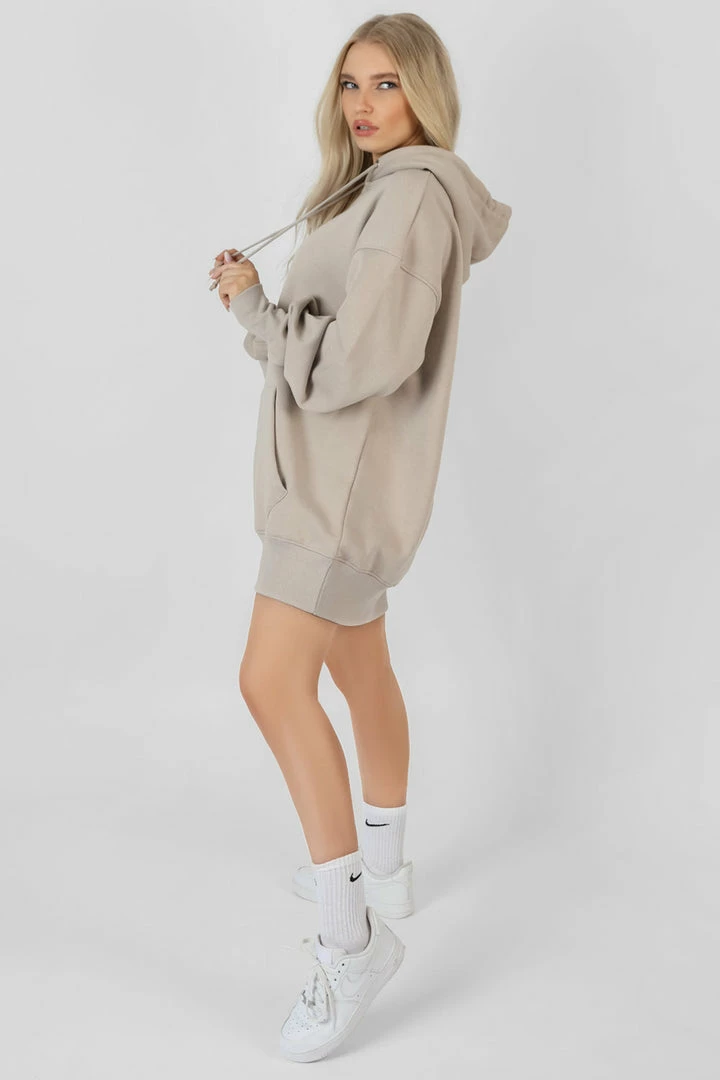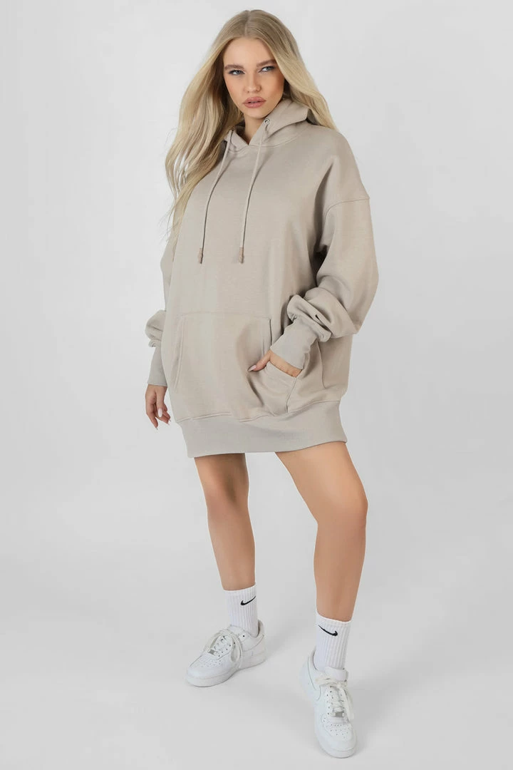 A long sleeved oversized fit hoodie dress in ash featuring a front pocket and drawstring in the hood.