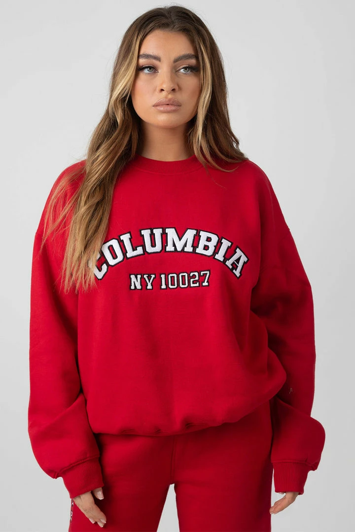 An oversized fit sweatshirt in red with ‘COLUMBIA’ embroidered on