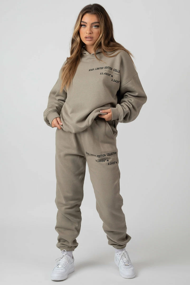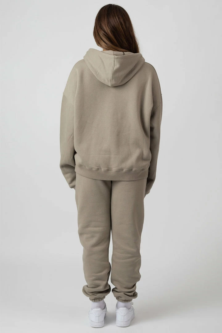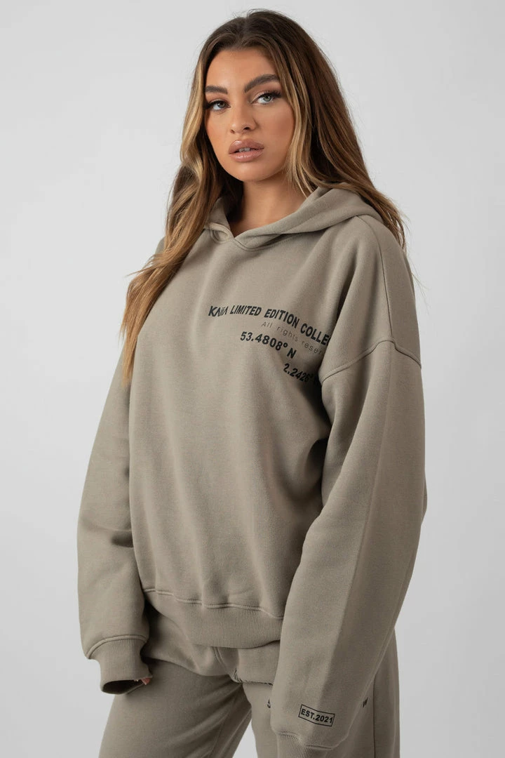 AN OVERSIZED FIT HOODIE IN LIGHT KHAKI WITH TEXT DETAILING