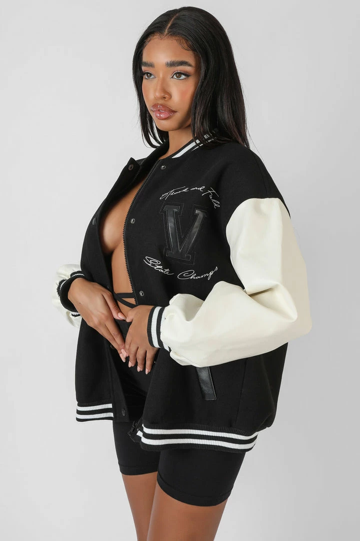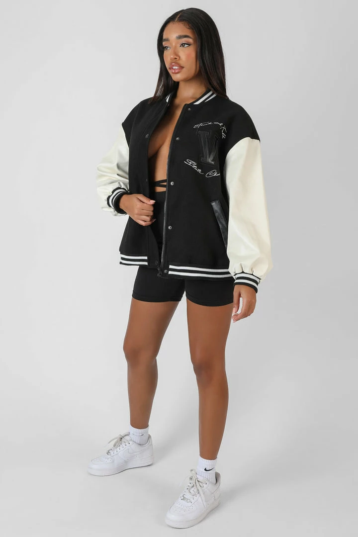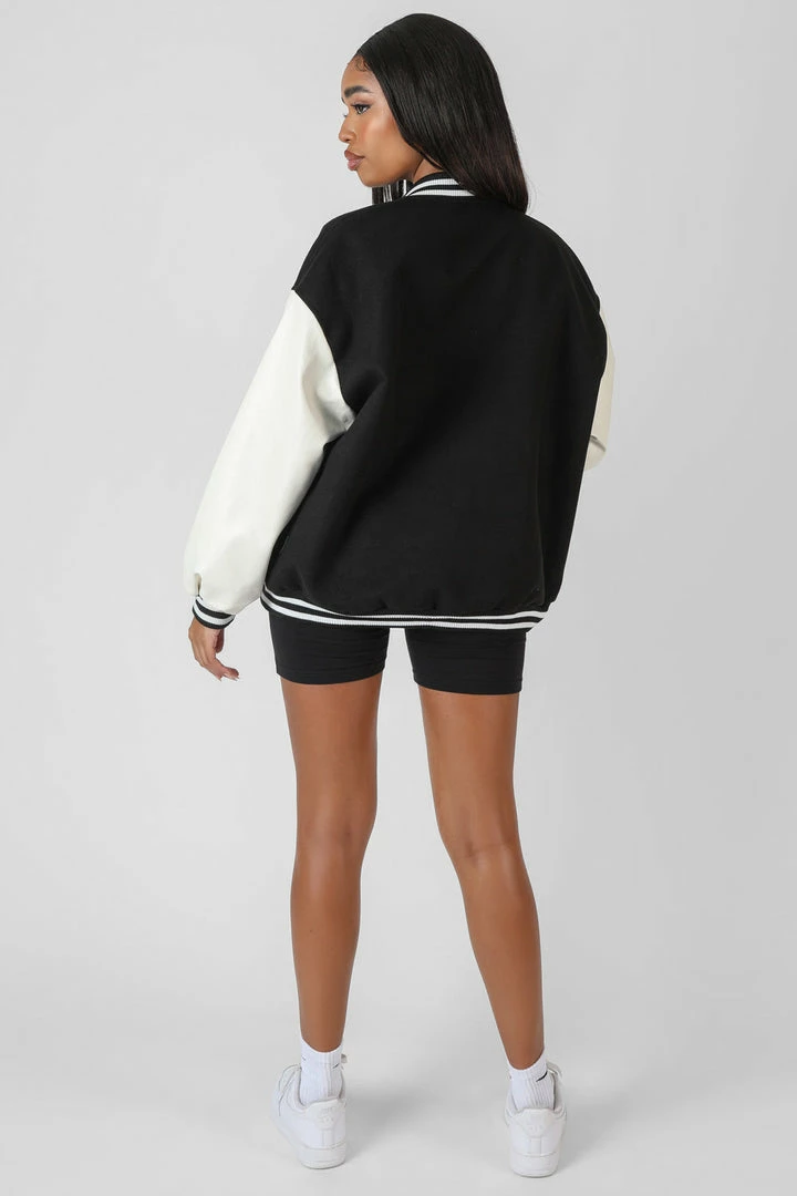Layer up in style this Autumn with this oversized varsity jacket featuring a black body with black pu details and contrasting white pu sleeves.
