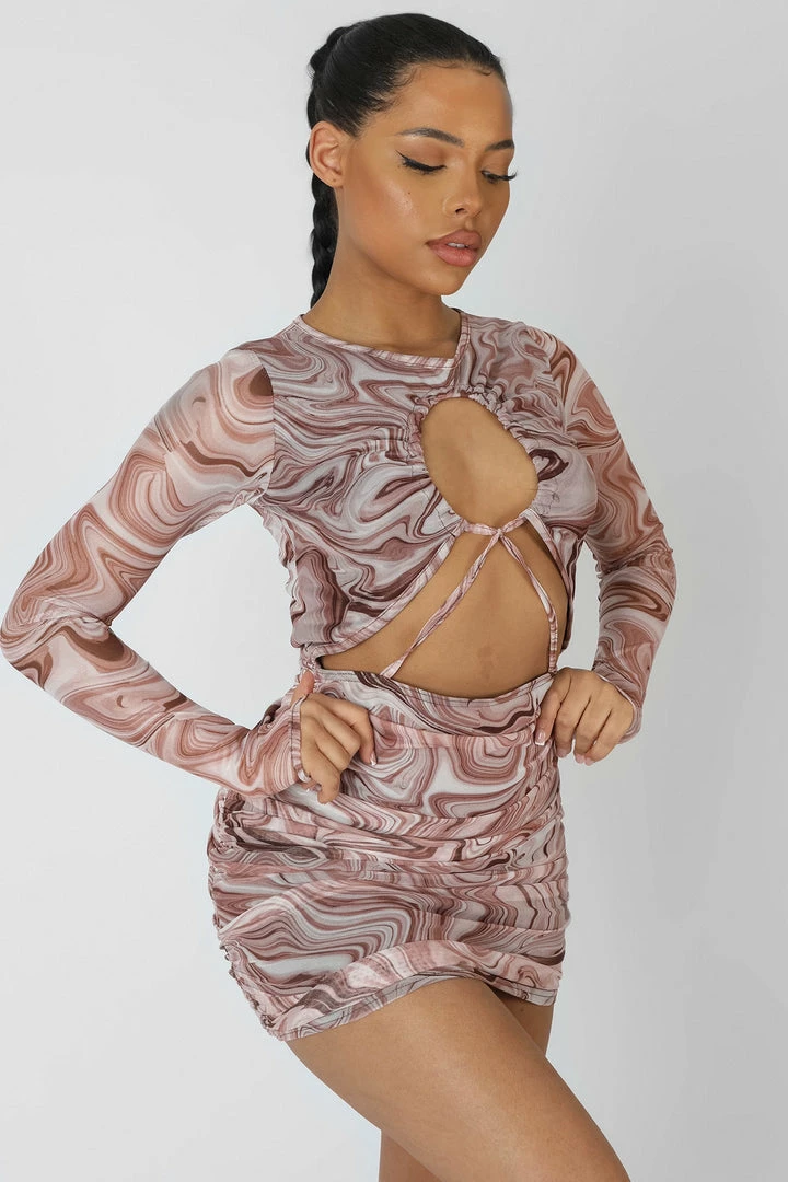 A MINI DRESS WITH CUT OUT DETAILING IN A PRINTED BROWN SWIRLY MESH PATTERN.