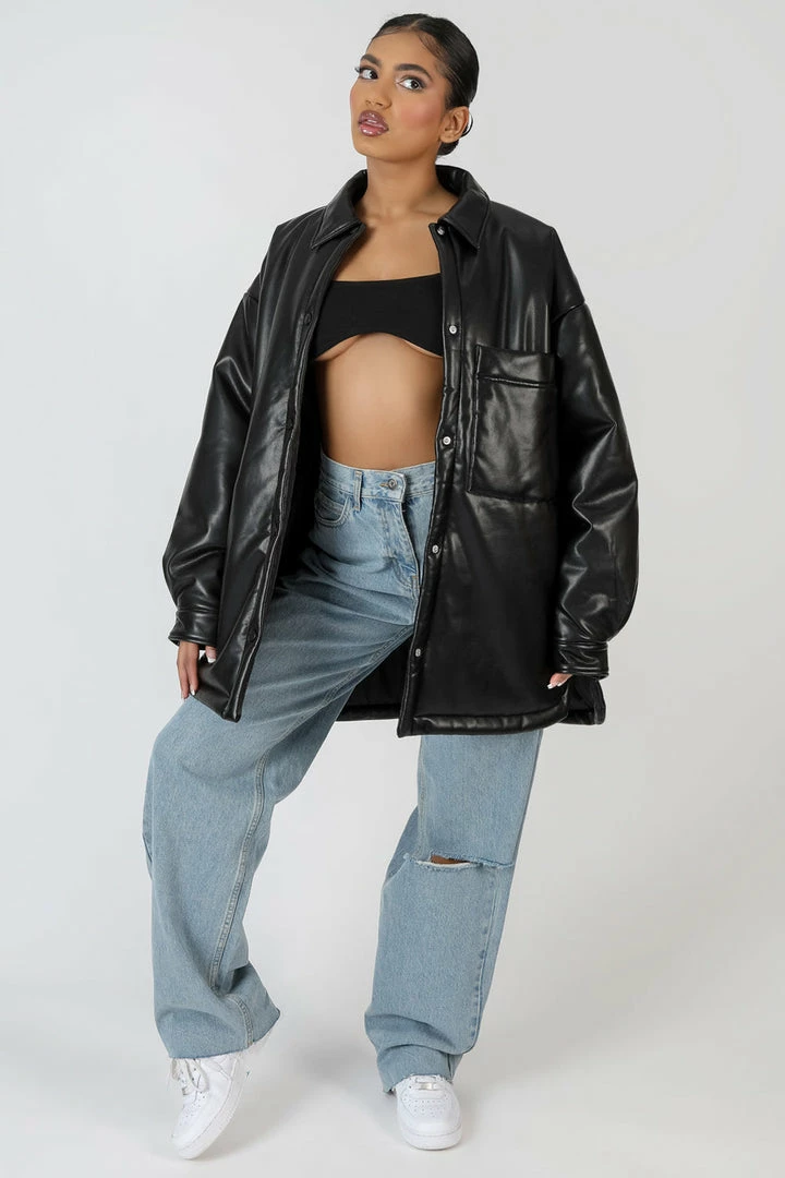 Update your Autumn style with this oversized padded shacket with an oversized fit and in a pu black material.