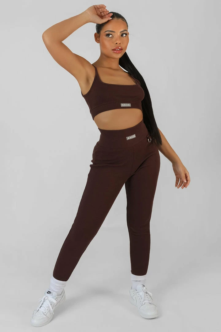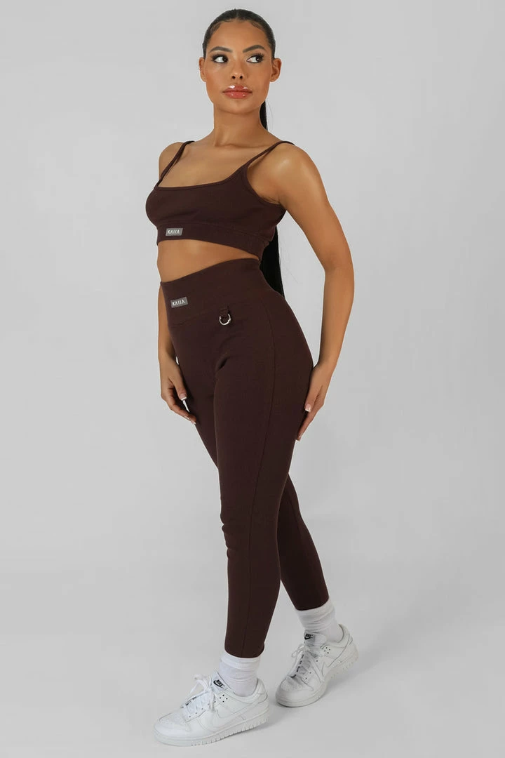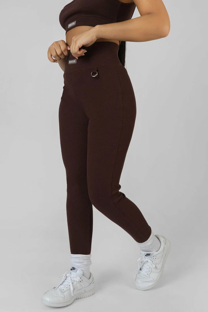 HIGH WAISTED RIBBED CHOCOLATE LEGGINGS.