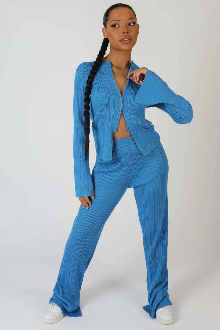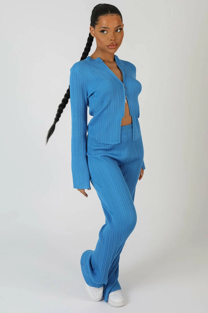 LONG WIDE LEG BLUE KNITTED RIBBED TROUSERS