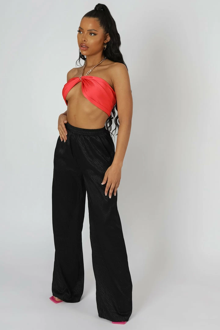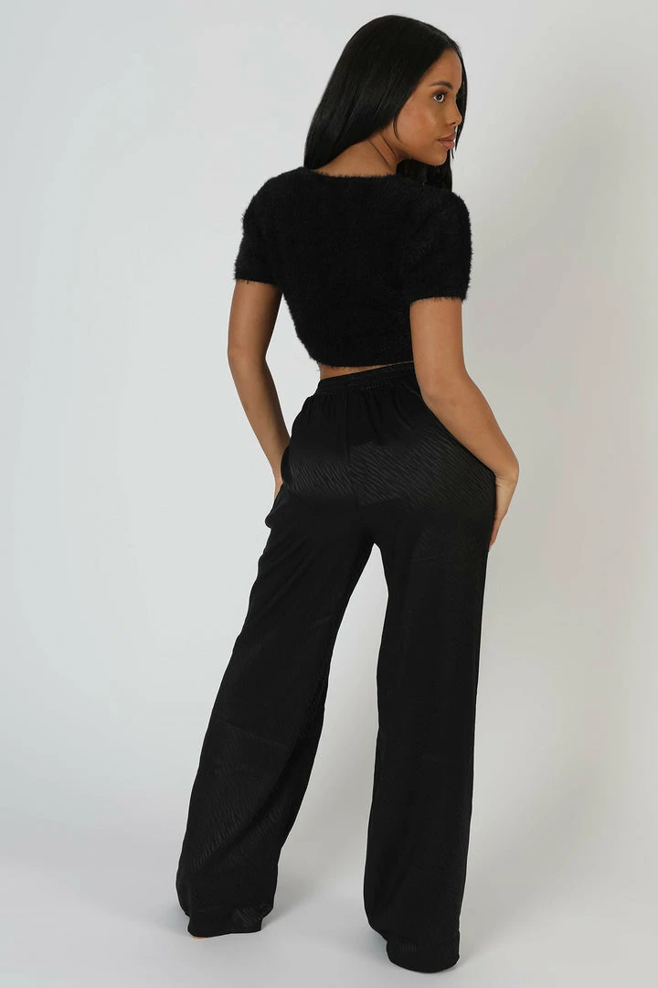 WIDE LEG SATIN TROUSERS IN BLACK WITH TONAL ZEBRA PRINT ON THEM FEATURING AN ELASTICATED WAIST BAND.