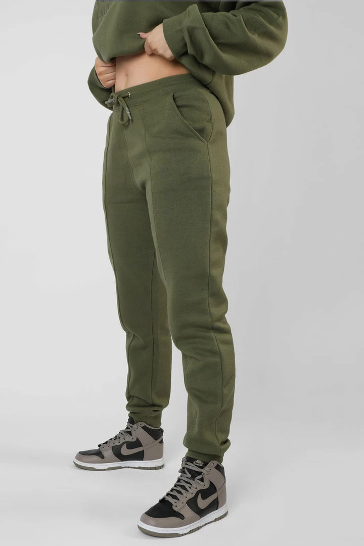 KHAKI HIGH WAISTED JOGGERS WITH A DRAWSTRING AND SEAM FRONT DETAILING.