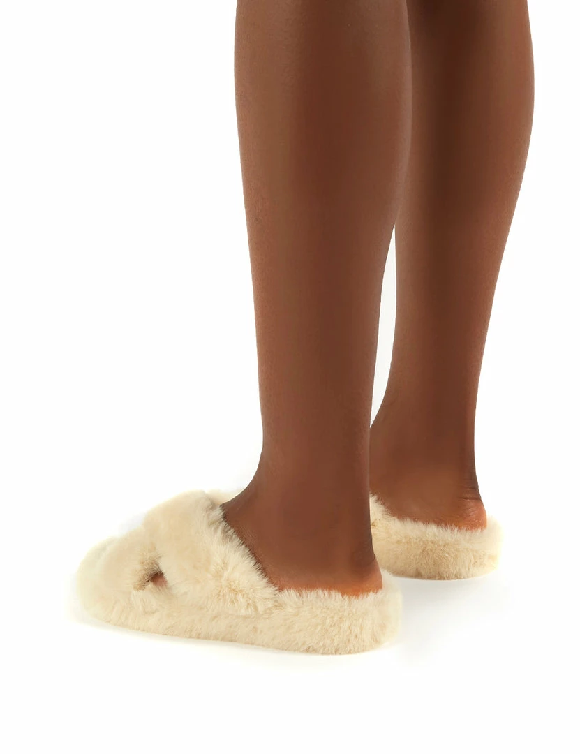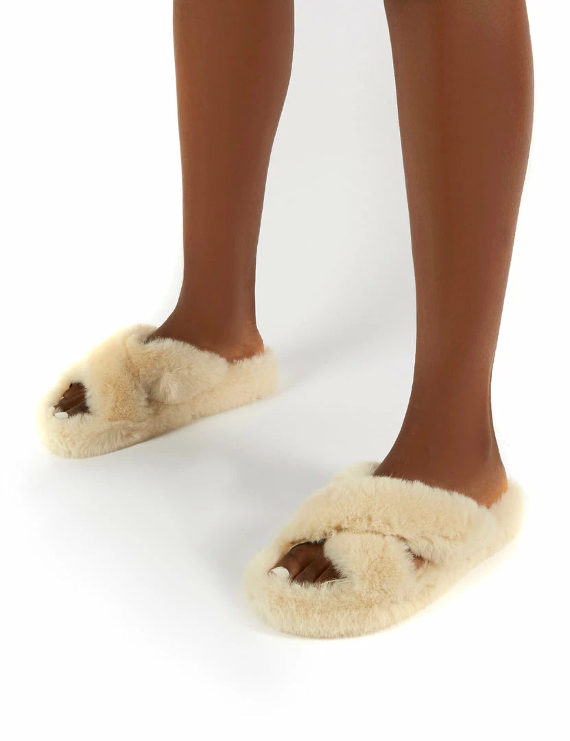 Snuggles features fluffy faux fur with cross over straps. Pair these slippers with your fave loungewear to complete the look.