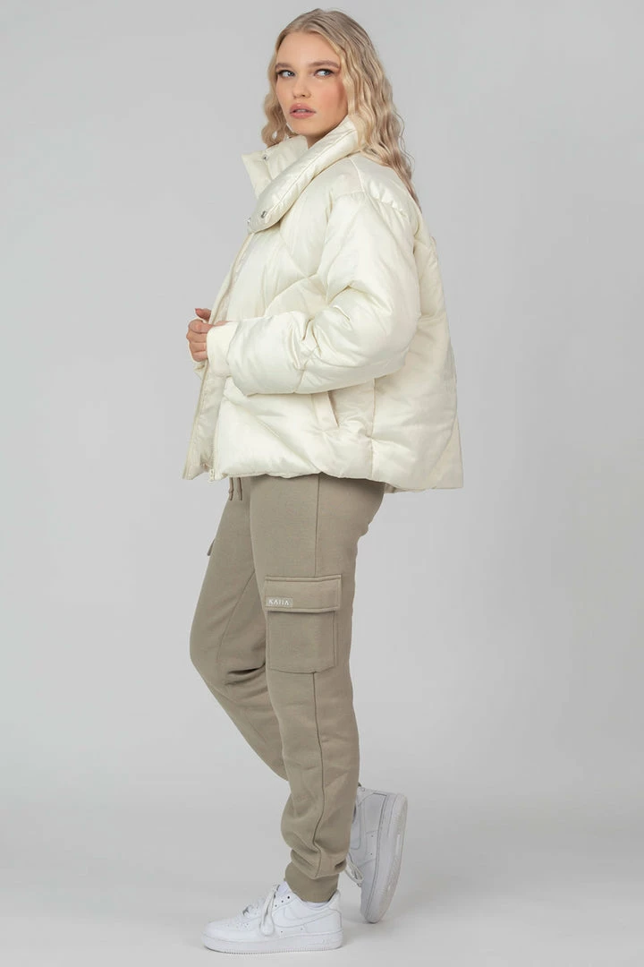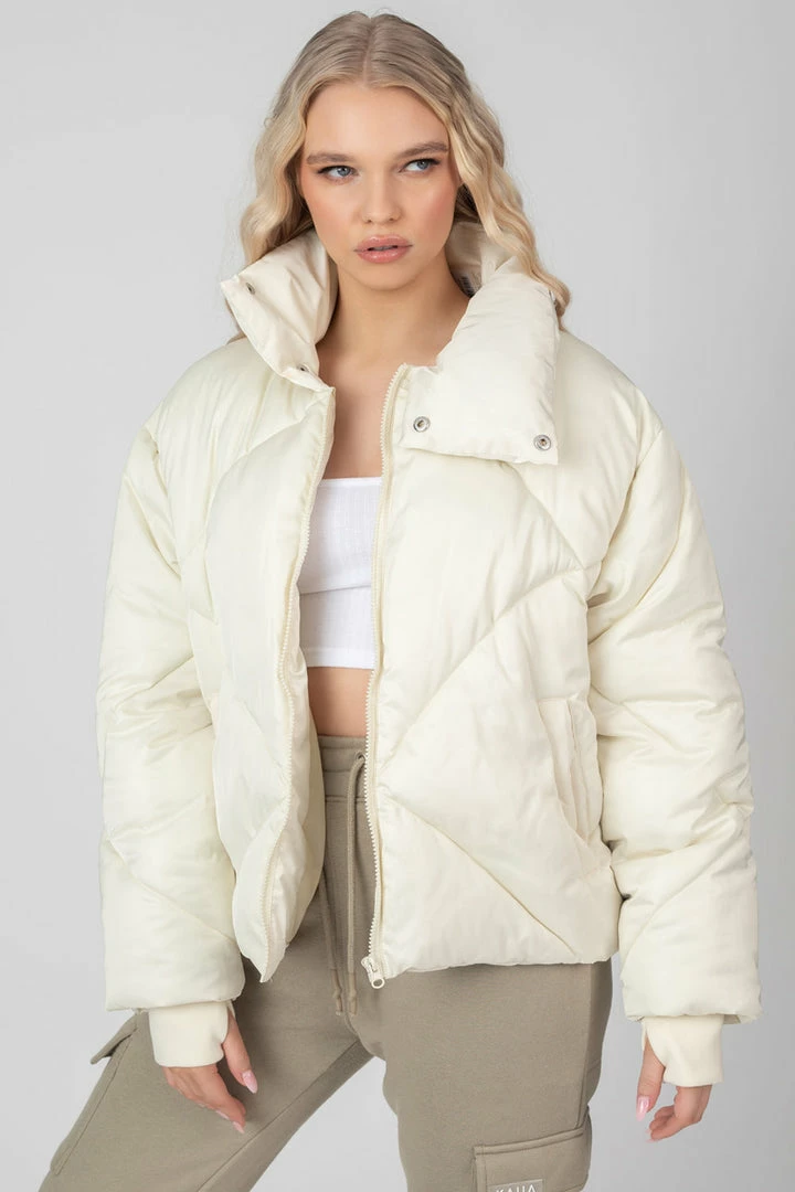 Give your off-duty look a chilled vibe with this quilted puffer jacket. Featuring a soft touch material, front pockets, zip fastening and high neck collar in ecru.