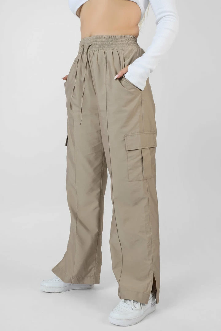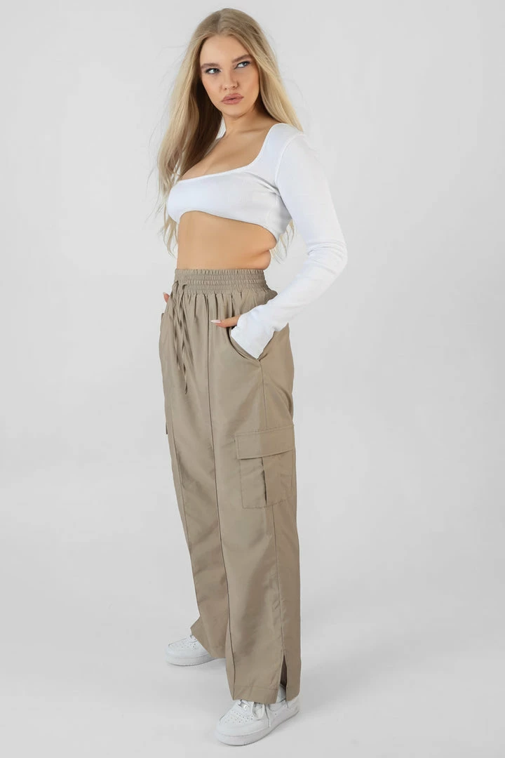 WIDE LEG CARGO STYLE TROUSERS IN STONE FEATURING SPLIT HEMS AND A DRAW STRING WAIST.