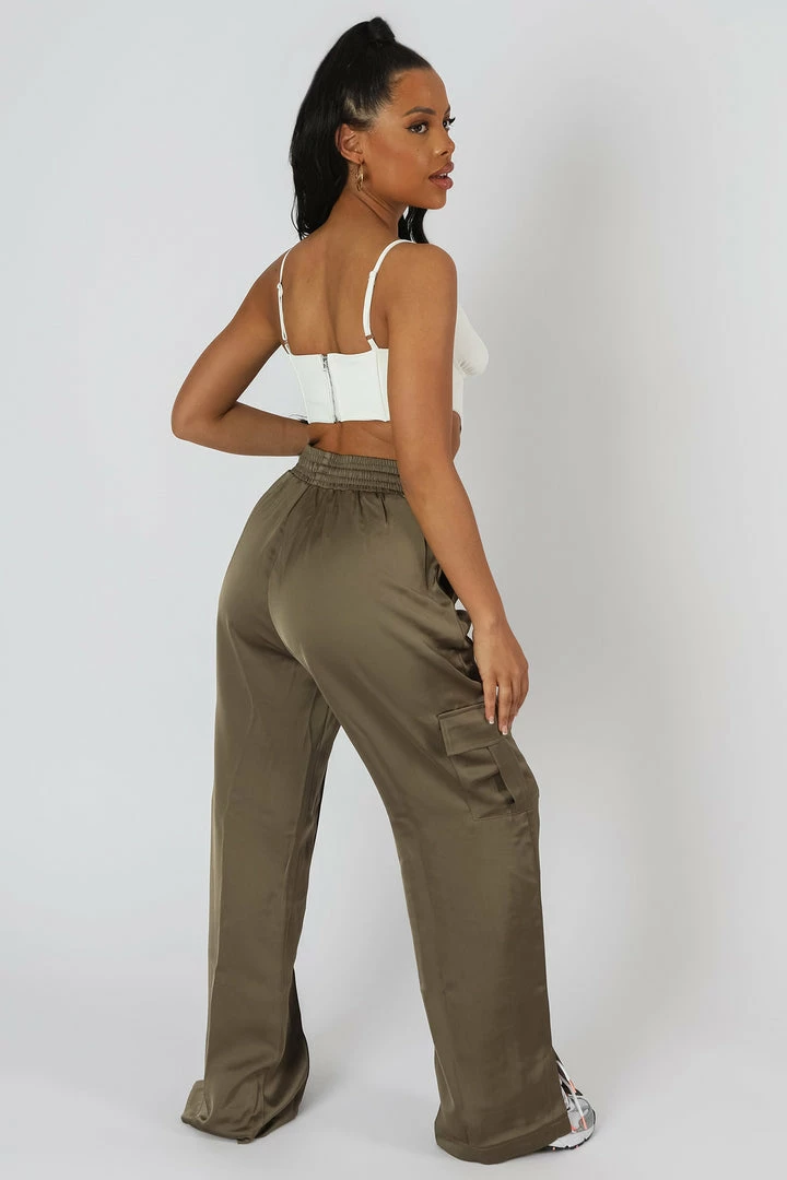 OUR ICONIC HIGH WAISTED ELASTICATED WAIST SPLIT HEM CARGOS NOW IN A SATIN KHAKI
