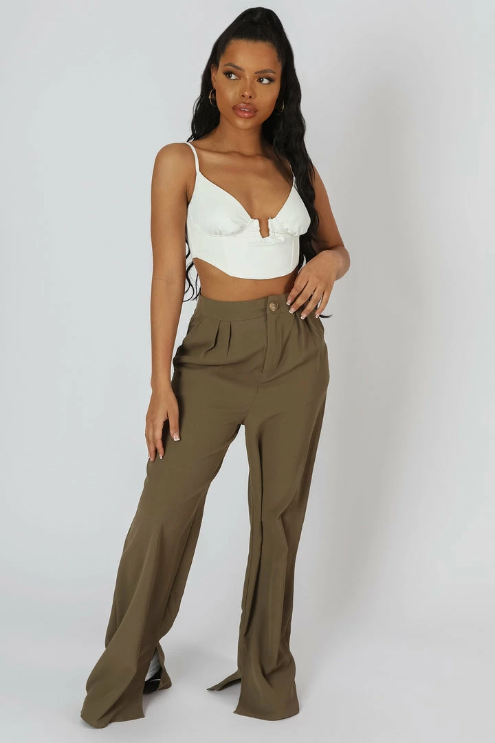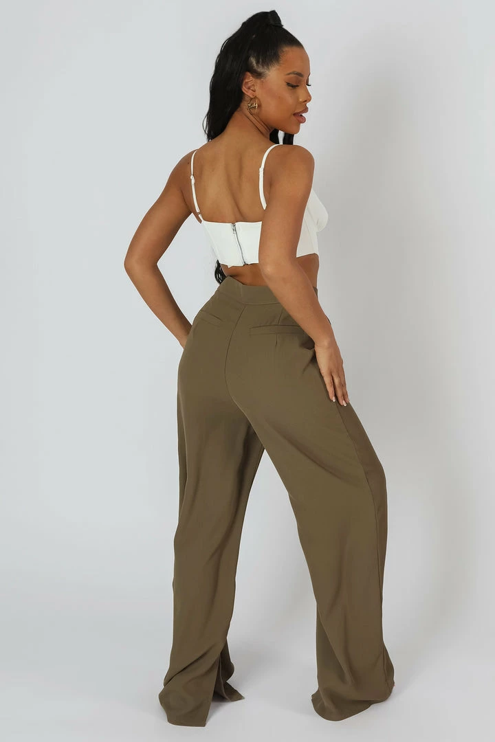 WIDE LEG SPLIT HEM TAILORED HIGH WAISTED TROUSERS IN KHAKI.