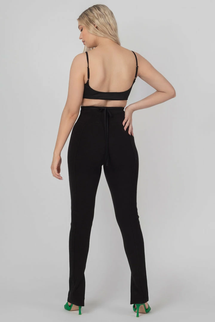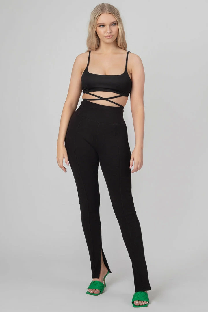 A thin strapped bralet with a square line in black with a strappy waist detail.
