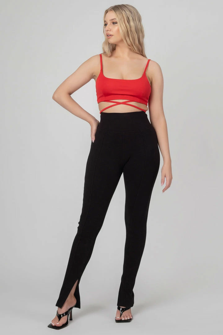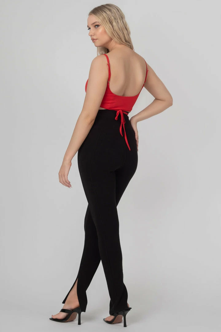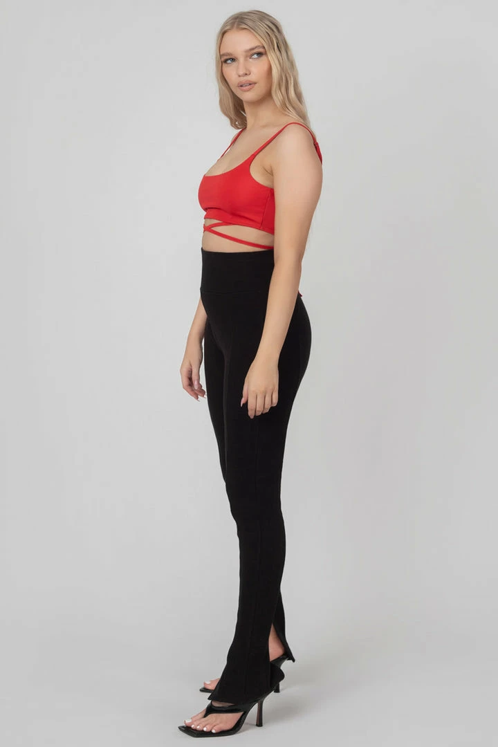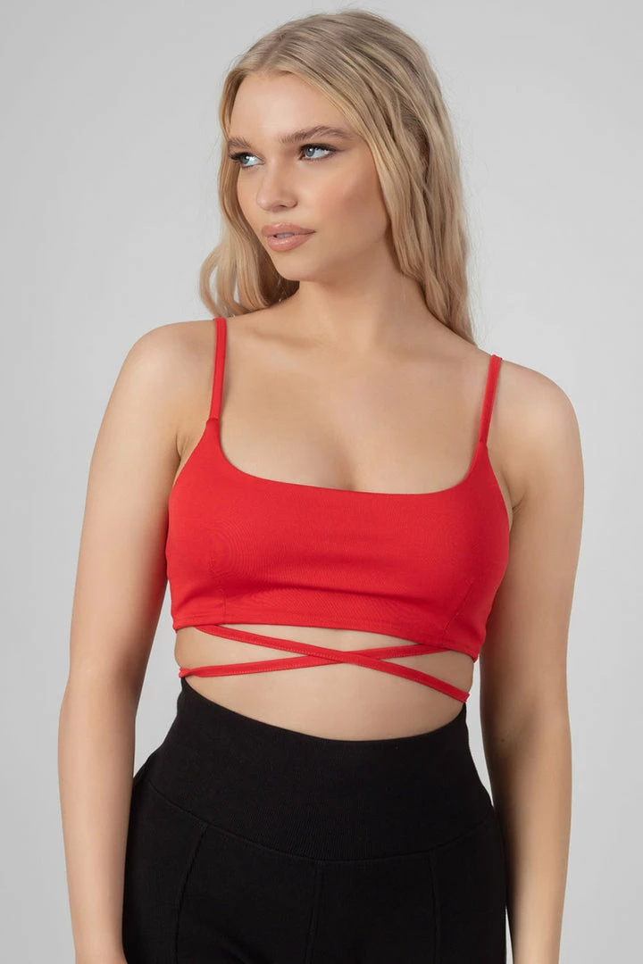 A THIN STRAPPED BRALET WITH A SQUARE LINE IN RED WITH A STRAPPY WAIST DETAIL.