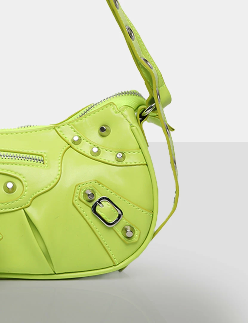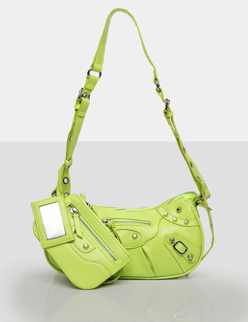 Public Desire UK The Trackstar Lime Green Pu Studded Mirror Zip Detail Handbag NEW IN