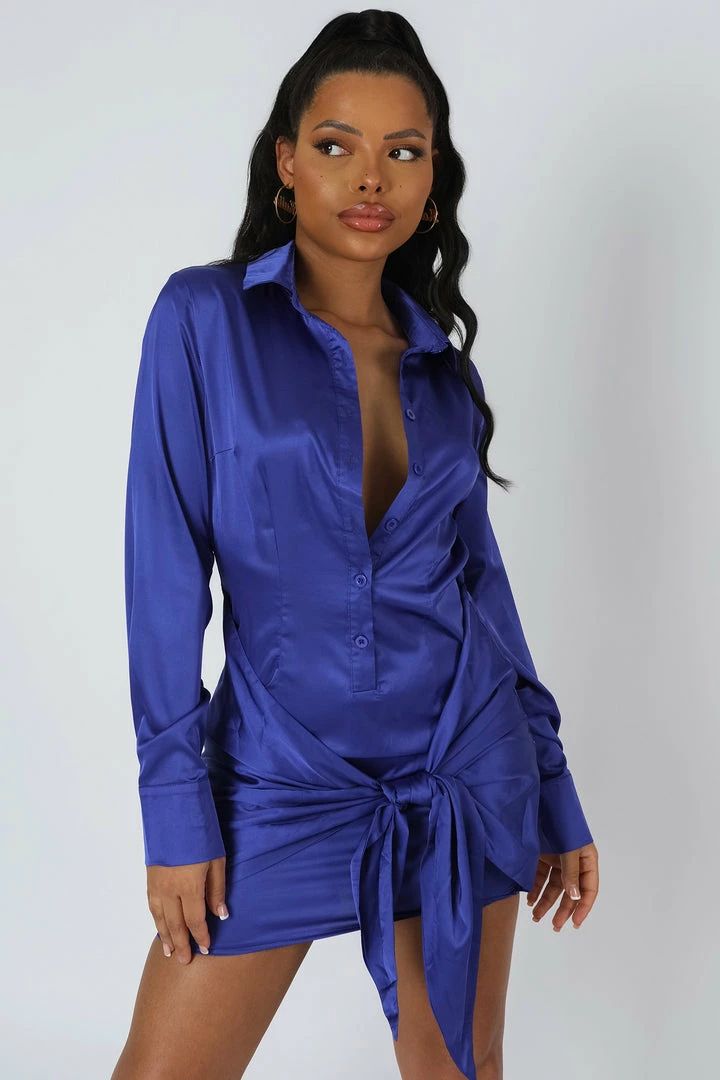 A BODYCON BUTTON DOWN MINI DRESS IN PURPLE SATIN WITH A TIE WAIST FEATURE.