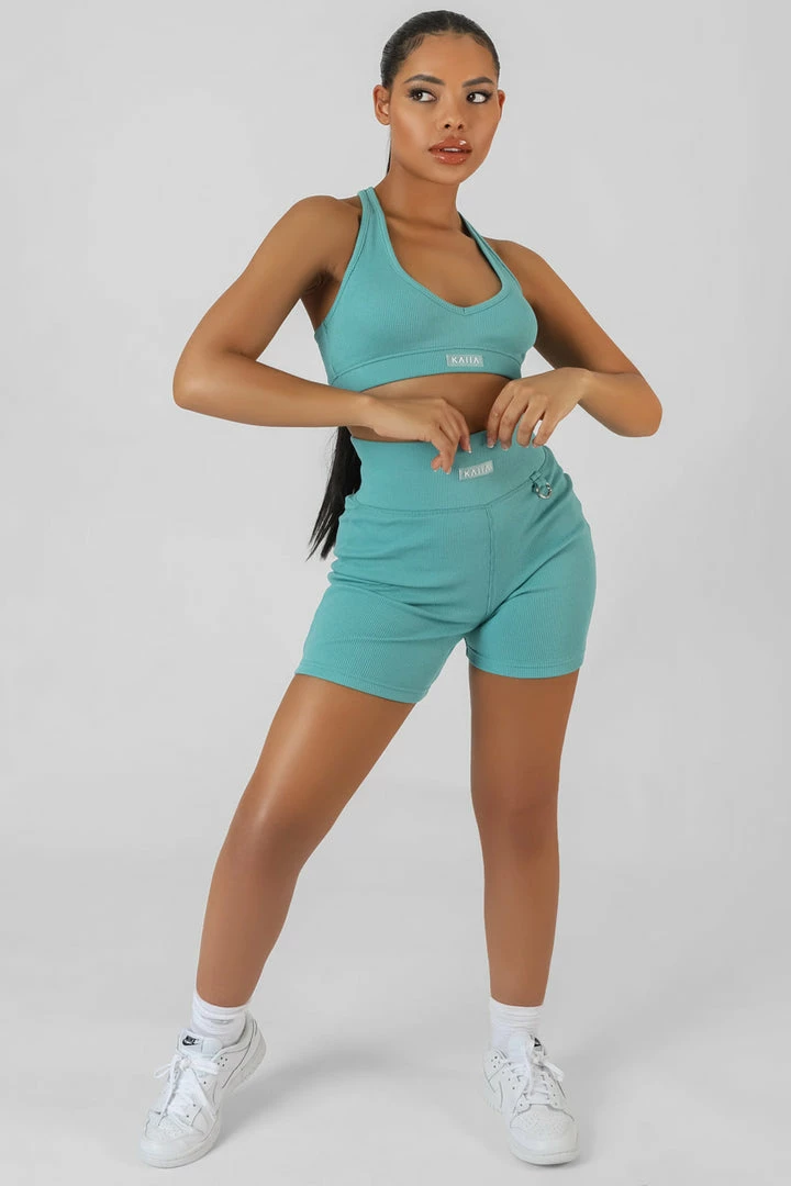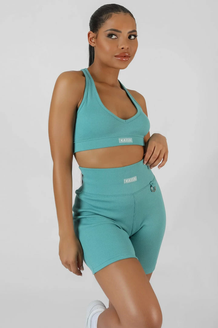 A SPORTS STYLE BRALET IN OCEAN BLUE WITH A V NECK