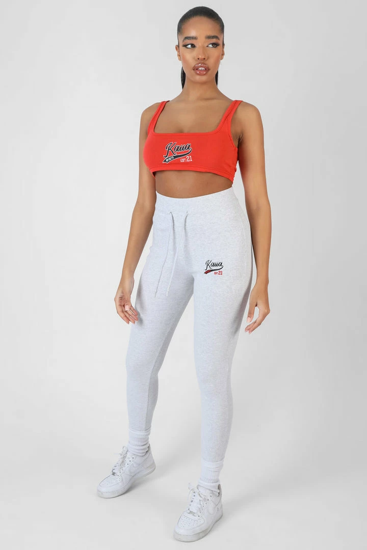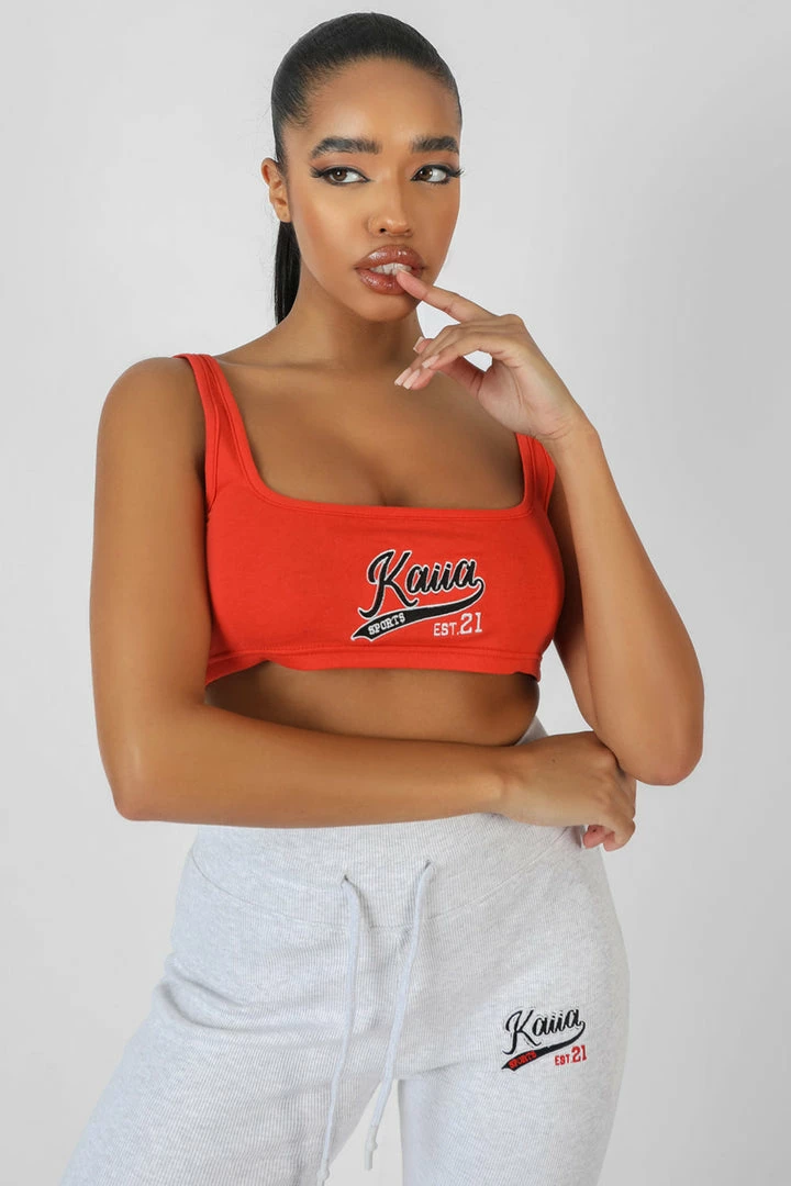 AN ATHLEISURE WEARÂ BRALET IN FLAME RED WITH VARSITY STYLE KAIIA BRANDING