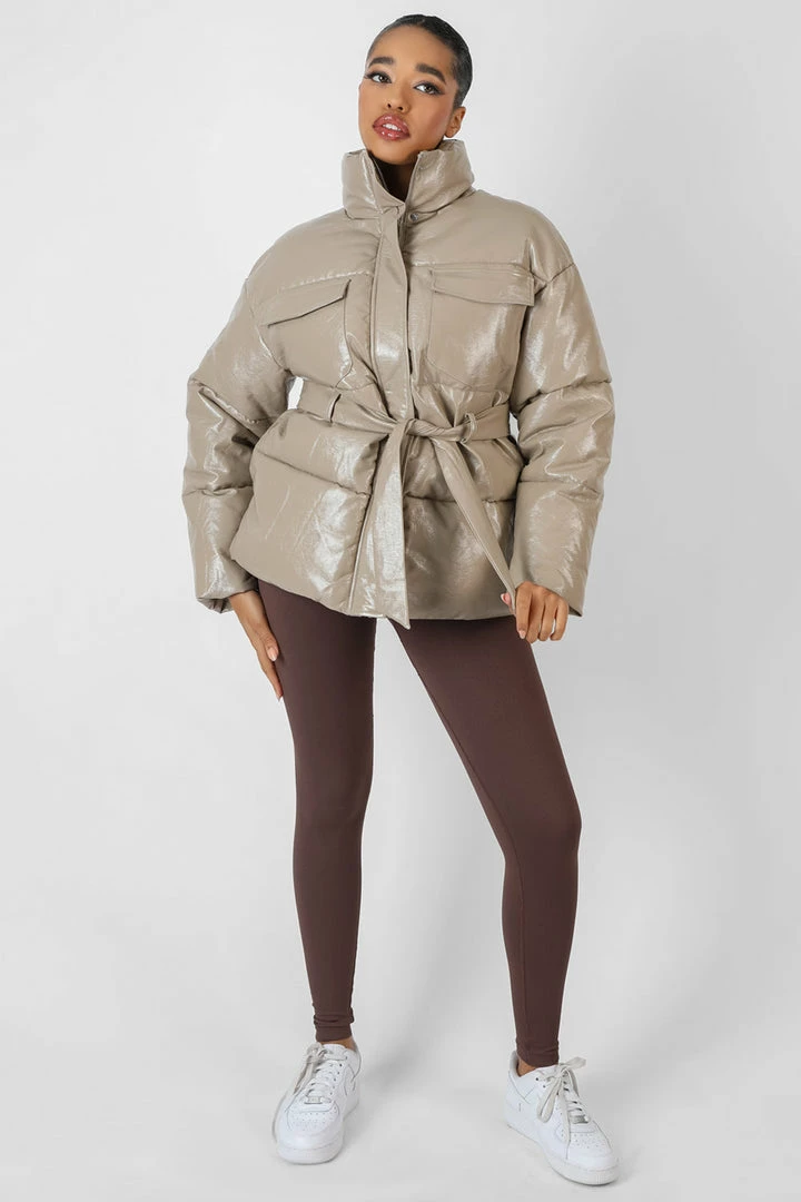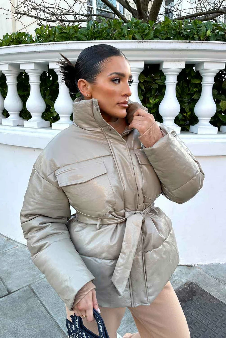 Update your Autumn wardrope with this vinyl puffer in stone featuring a belt tie and front pockets.