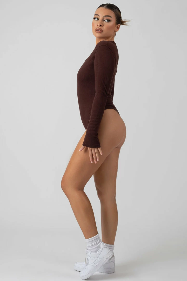 A ribbed bodysuit in light brown with long sleeves and functional zip down the front.