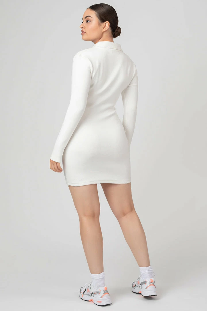 A white mini dress in a ribbed material with long sleeves and a functional zip running down the centre of this mini dress,